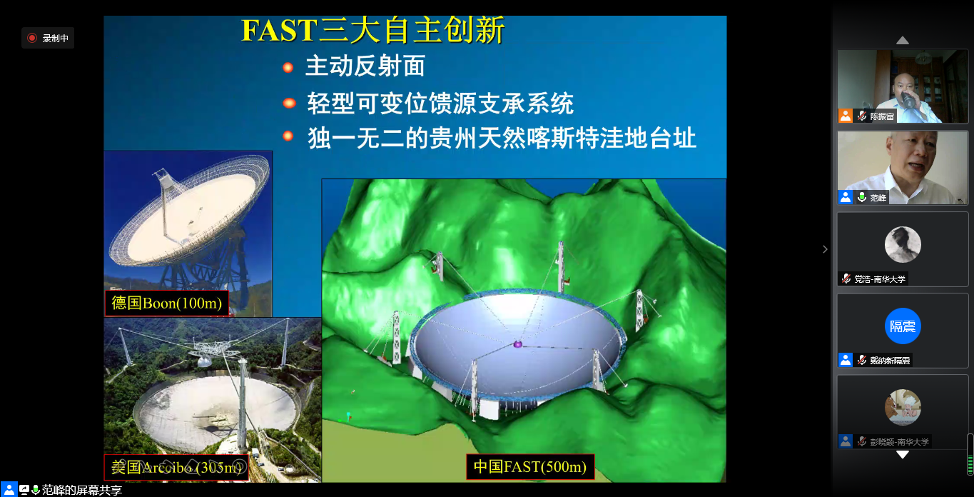 上午9:00,由哈尔滨工业大学范峰教授作学术报告,题目为《500口径巨型望远镜FAST(天眼)结构关键问题研究》,必赢76net官网陈振富书记主持。范教授先介绍了“巨型望远镜FAST”项目并引出了建设中最重要的结构系统,然后详细讲述了FAST主动反射面结构总体方案、关键技术和30m模型试验三个方面的内容。讲解采用工程实践与理论相结合的方式,包扩了从结构的选型到模型的建立和优化,从各方面结构性能的影响分析到健康监测和故障诊断。最后范教授对师生提出的一些疑问进行详细解答,并指出我国正处于从建造大国到建造强国的发展阶段,土木工程起着重要作用,未来也非常光明,希望我们土木学子积极投身建设事业,为国家做贡献。