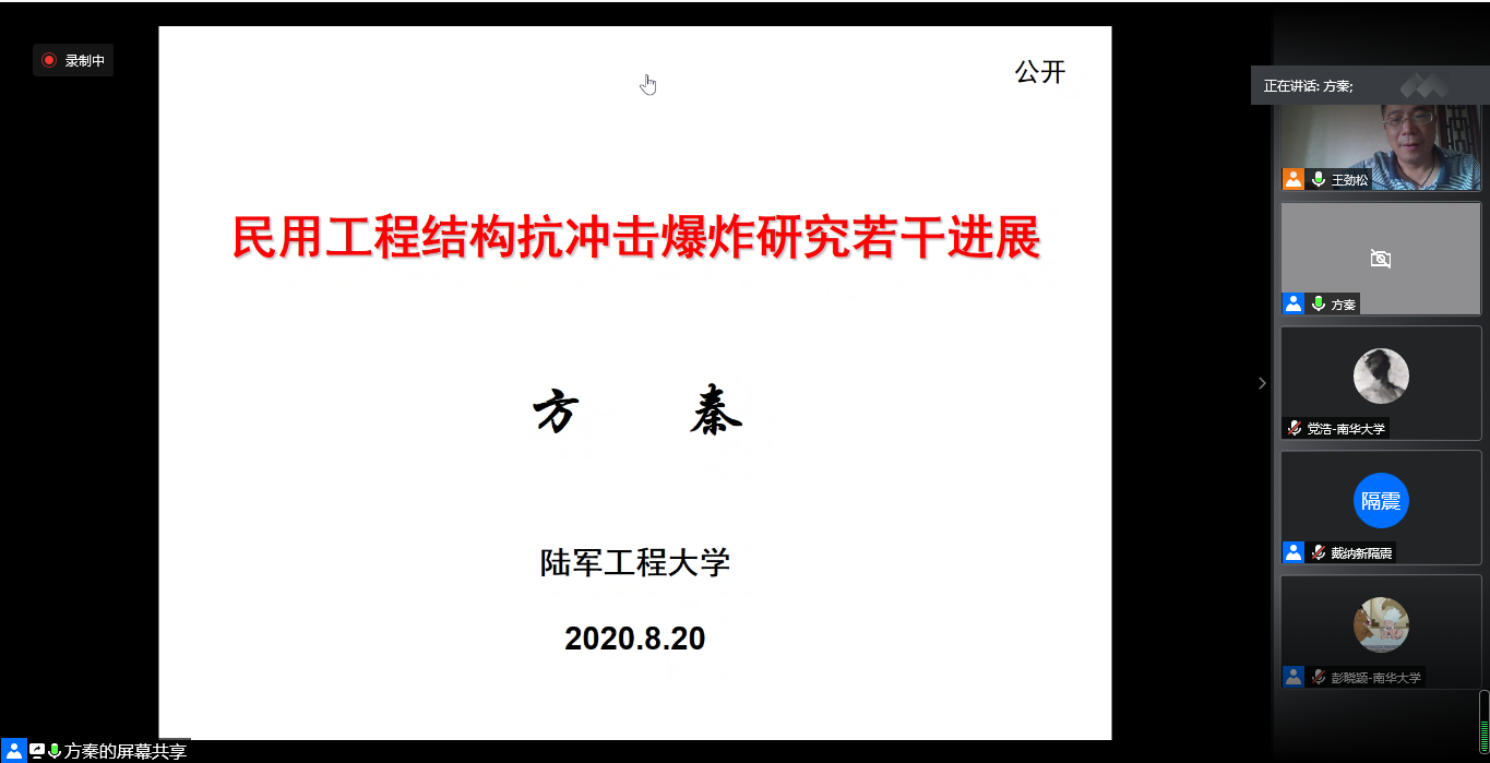下午15:30,由陆军工程大学方秦教授作学术报告,题目为《民用工程结构抗偶然性冲击爆炸若干研究进展》,必赢76net官网王劲松副院长主持。方教授的讲解内容主要包括抗爆基本知识和数值模拟方法。抗爆基本知识包括了建筑物抗恐怖爆炸袭击、燃油气等危化品爆炸灾害效应及防护、核电站结构抗大型客机撞击、提高结构抗爆能力的新材料新结构新技术和抗爆结构设计计算方法等,数值模拟方面则详细讲解了建模及分析方法。最后方教授回答了同学们提出的一些问题和想法。