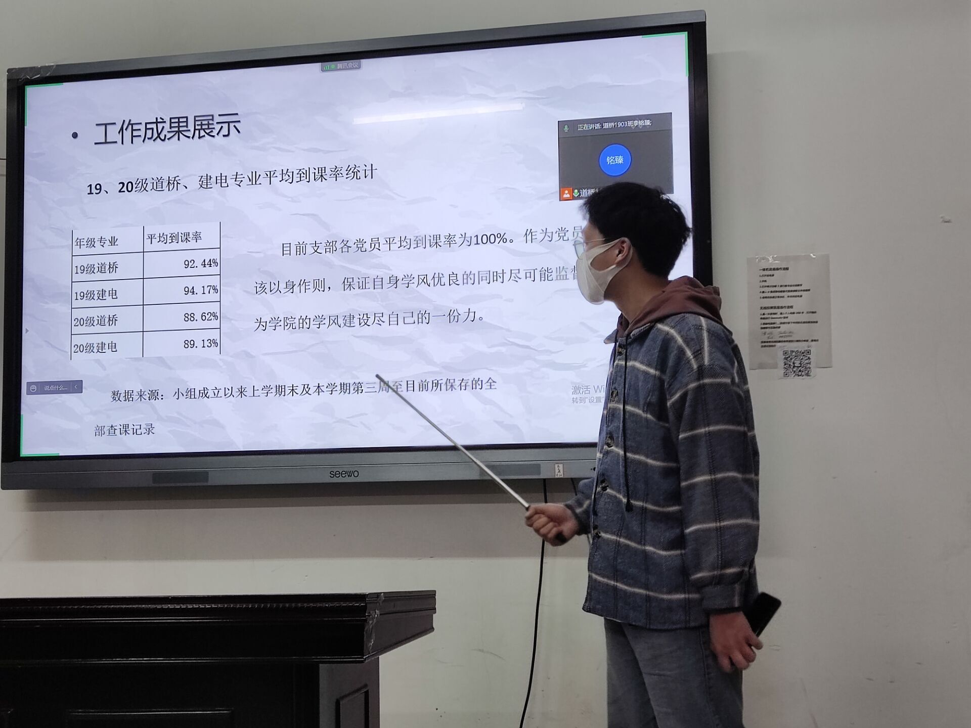 2022年3月24日19:00,必赢76net官网道桥和建电专业学生党支部在土木楼四楼会议室召开组织生活会暨民主评议党员工作。会议由李铭臻同志主持,副院长刘清老师到会指导点评,支部全体党员参加会议。