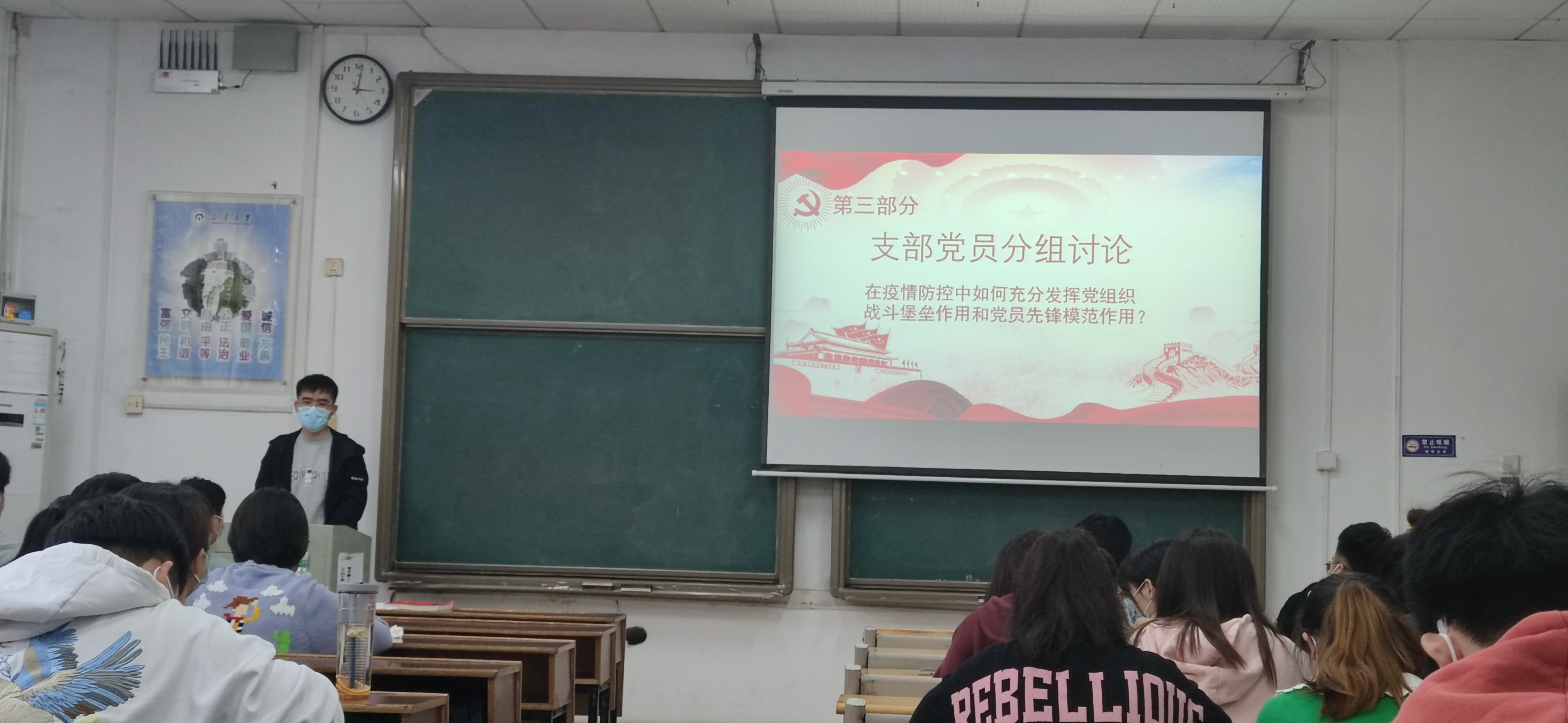 活动第三项,支部党员分组讨论并分享心得体会。赵峥琪、张成隆等五位小组代表上台发言,分享了在疫情防控中如何发挥学生党员的先锋模范作用的见解,以及他们在疫情防控中如何将其落实到日常的行动。期间,张成隆同志谈到“在疫情防控过程中,作为学生党员,要对自己负责,对他人负责,对社会负责,积极主动配合防疫工作。”在近期疫情防控中,支部多名党员同志参与到了学校的志愿服务活动,组织班上的同学做好核酸检测,督促班级各寝室做好消毒和体温检测,提醒同学们佩戴口罩等等。在点多、面广、频发的疫情形势下,看似小小的举措,却维护着整个校园的安全。