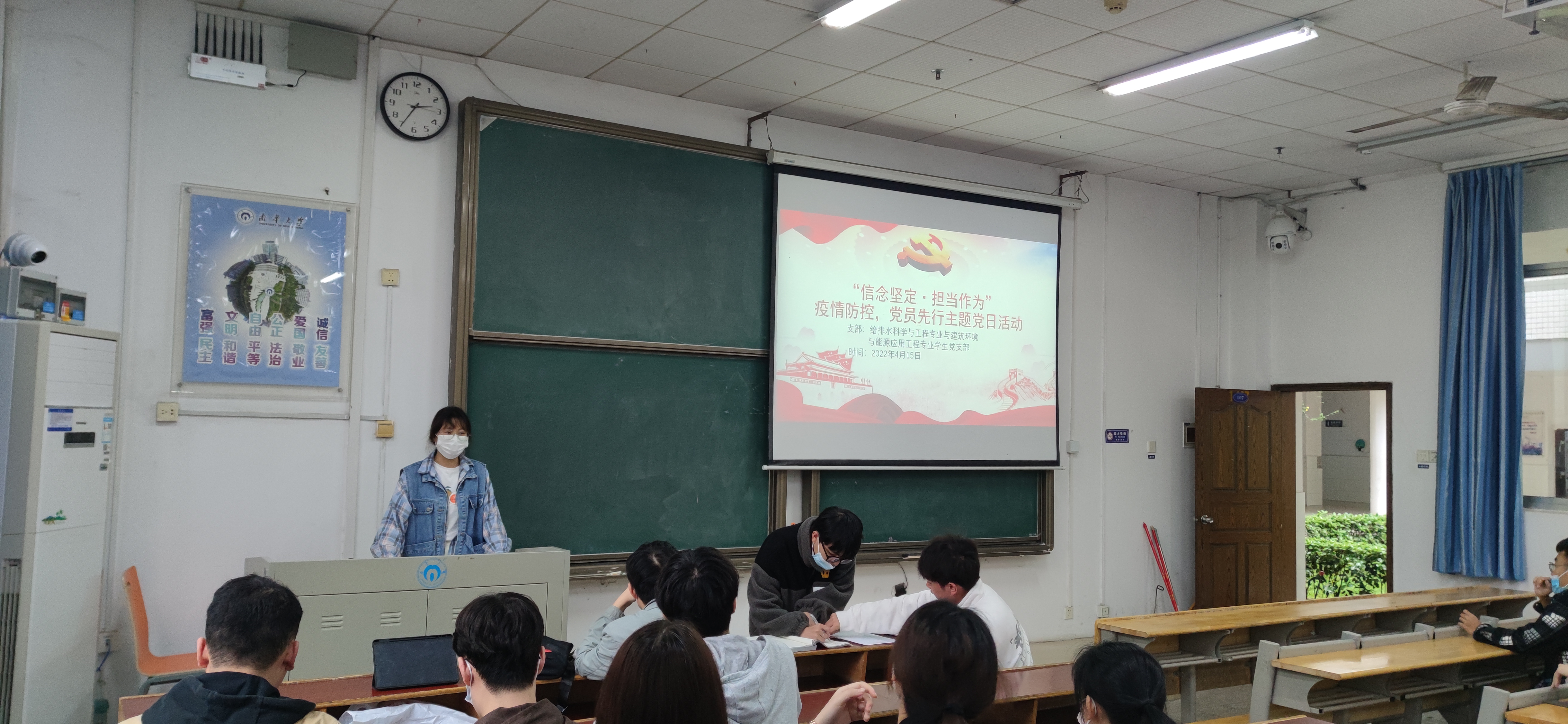 2022年4月15日下午14:30,必赢76net官网给排建环专业学生党支部于南华楼107开展“坚定信念.担当作为”疫情防控,党员先行主题党日活动。本次活动由给排建环专业全体学生党员以及支部书记贺淑珍老师参与。活动由倪朝霞同志主持。