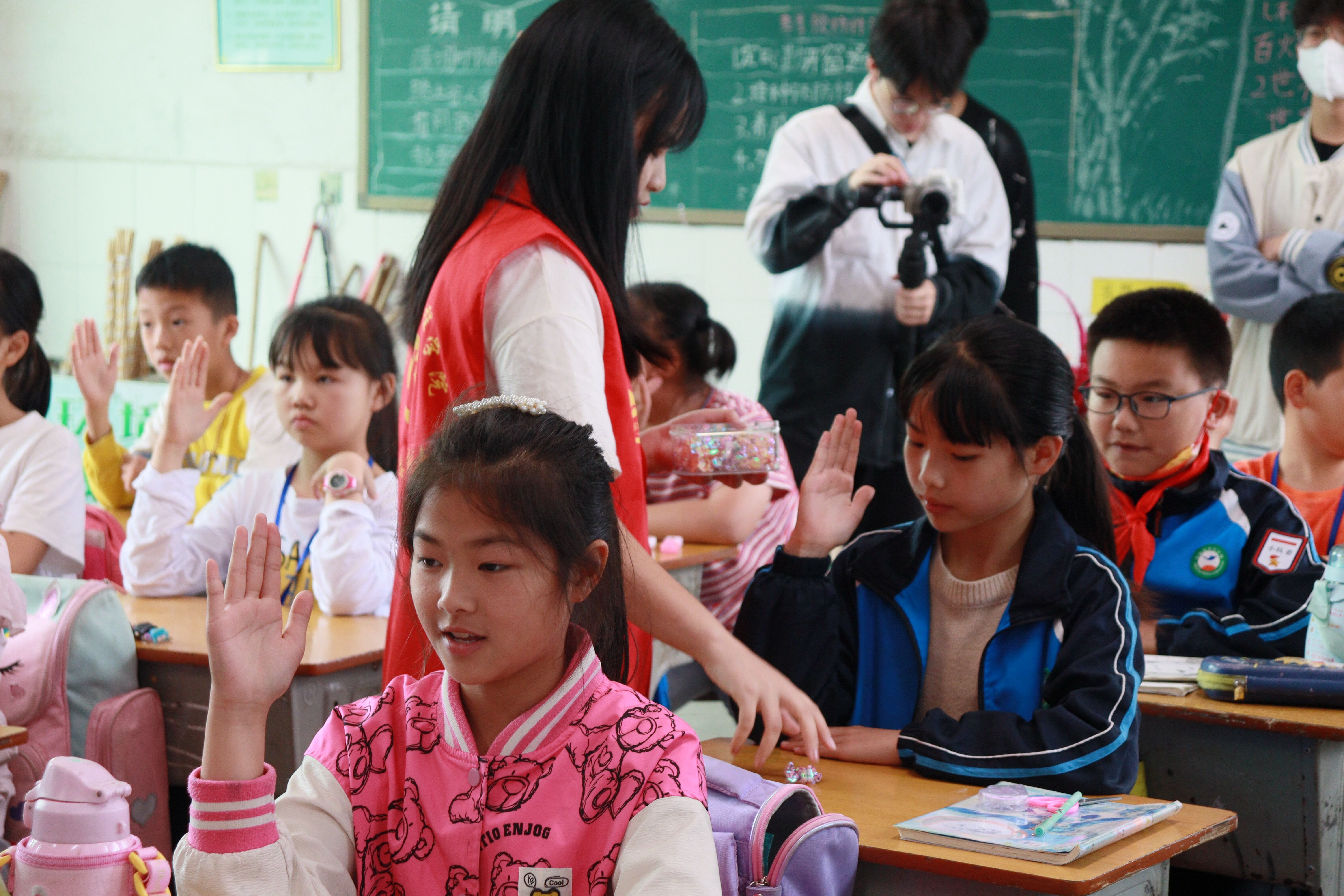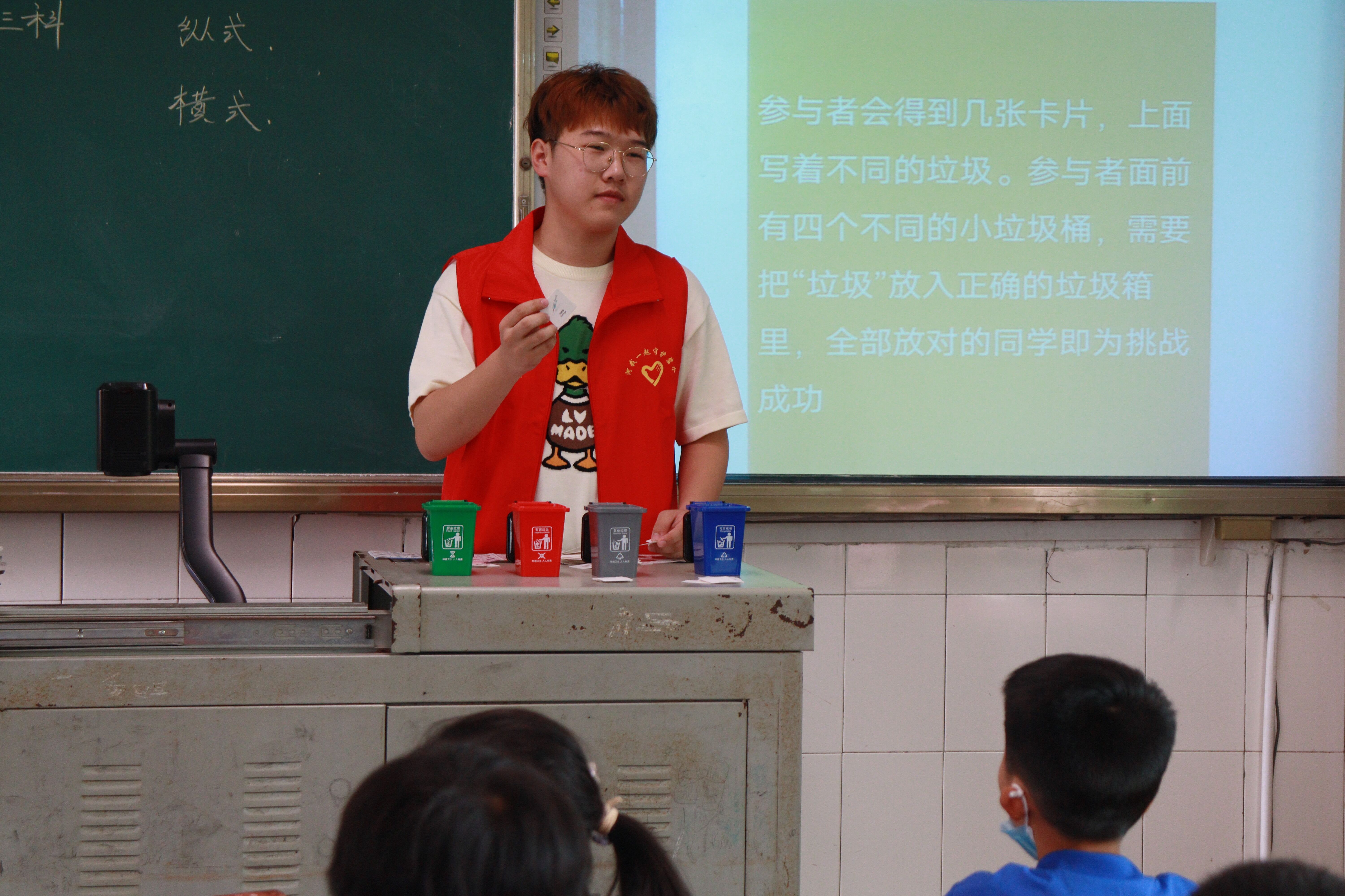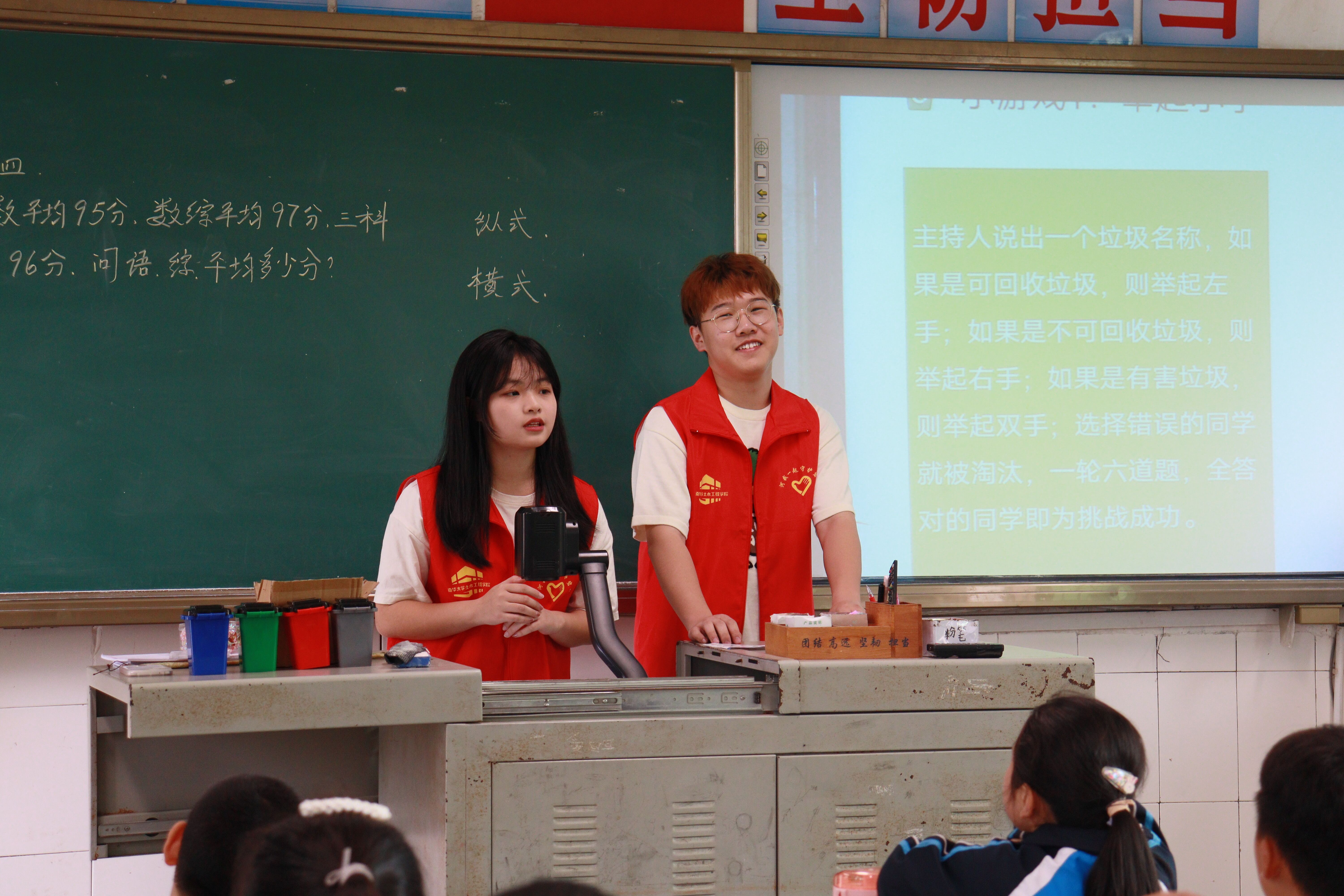 活动伊始,志愿者们进入四年级部分班级教室,借助生动的PPT和视频对同学们讲解垃圾分类问题;邀请同学们上台讲述生活中垃圾堆放的不文明事例;并呼吁同学们在生活中爱护环境,进行垃圾分类。随后,志愿者们与小朋友们开展了一系列垃圾分类小游戏来让他们充分认识到垃圾分类方法。在各志愿者的陪伴下,同学们积极参与游戏,回答问题,向大家分享自己对垃圾分类的小知识。活动最后,志愿者们向同学们赠送书籍,邀请同学们在黑板上写下保护环境,垃圾分类的宣言,并鼓励他们向身边的人宣讲环境保护知识,增强环境保护意识。至此,本次活动圆满结束。