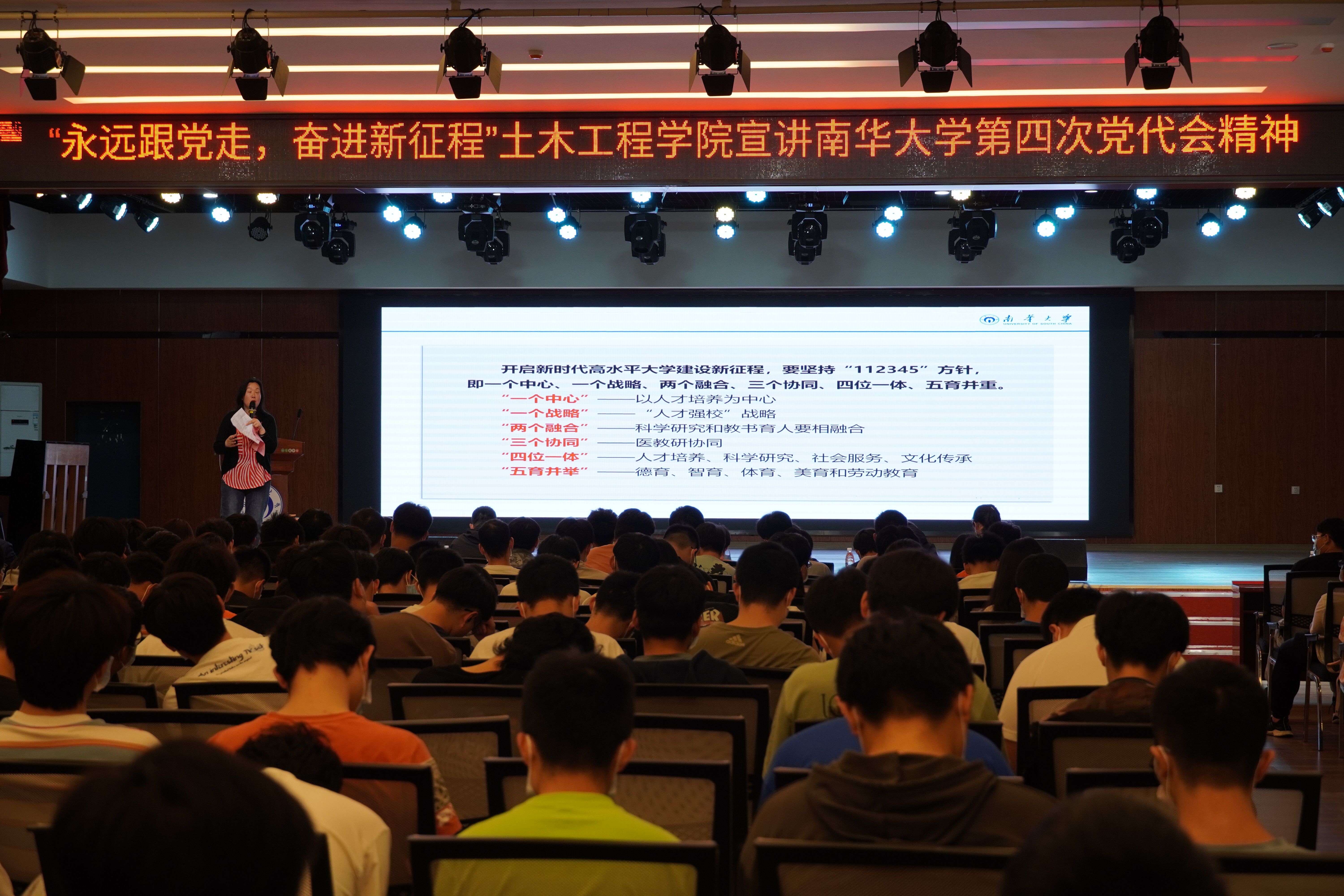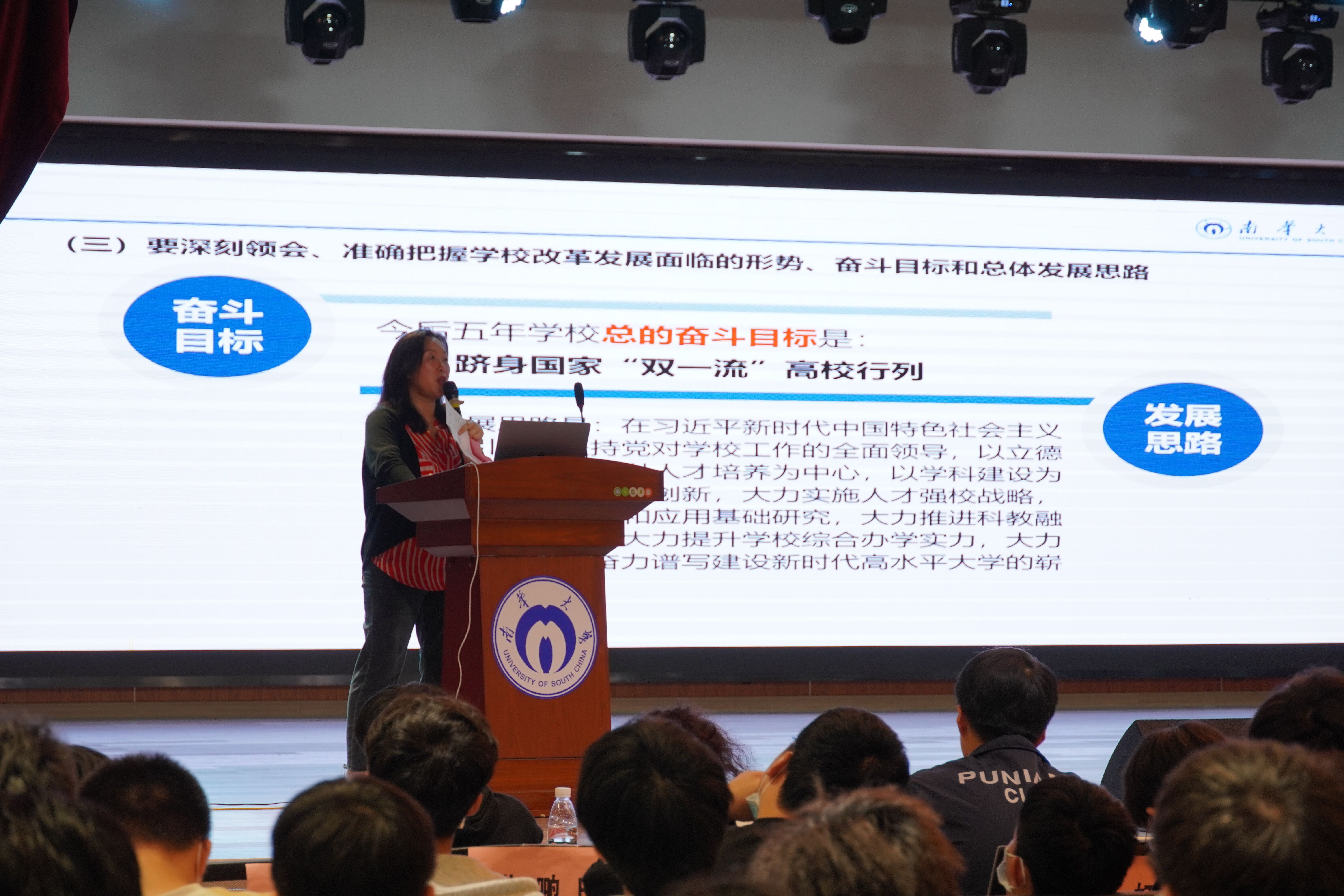会议伊始,唐素芝老师总结介绍了本次党代会工作的“三好”:一、会议报告写得好,报告总结过去,展望未来,字斟句酌,内容全面;二、高山书记讲得好,会场的八次掌声充分体现了书记动人心魄的讲话内容;三、会议效果好,会议内容详实,与会人员全神贯注,收获丰富。接着,唐老师带同学们回顾了衡阳市委书记秦国文在会上的重要讲话,引用秦书记的口号“南华有所想,衡阳有所谋;南华有所呼,衡阳有所应;南华有所盼,衡阳有所为”,号召大家一起努力,一起进步,为南华的美好未来共同奋斗。随后,唐老师重点宣讲了党代会中的“12345方针”和学校改革发展面临的形势、奋斗目标及主要任务等工作要求,深入浅出地传达了必赢76net官网第四次党代会精神,鼓舞同学们深刻领会和准确把握第四次党代会精神实质。最后,唐素芝老师总结大会重点内容,回顾学校过去六年的工作成就,强调学校实现未来五年跻身国家双一流高校行列的总目标,提出大家共同努力奋斗的要求,呼吁同学们不负时代,不负韶华,向着共同的目标不断奋进。至此,本次必赢76net官网第四次党代会精神宣讲会圆满结束。