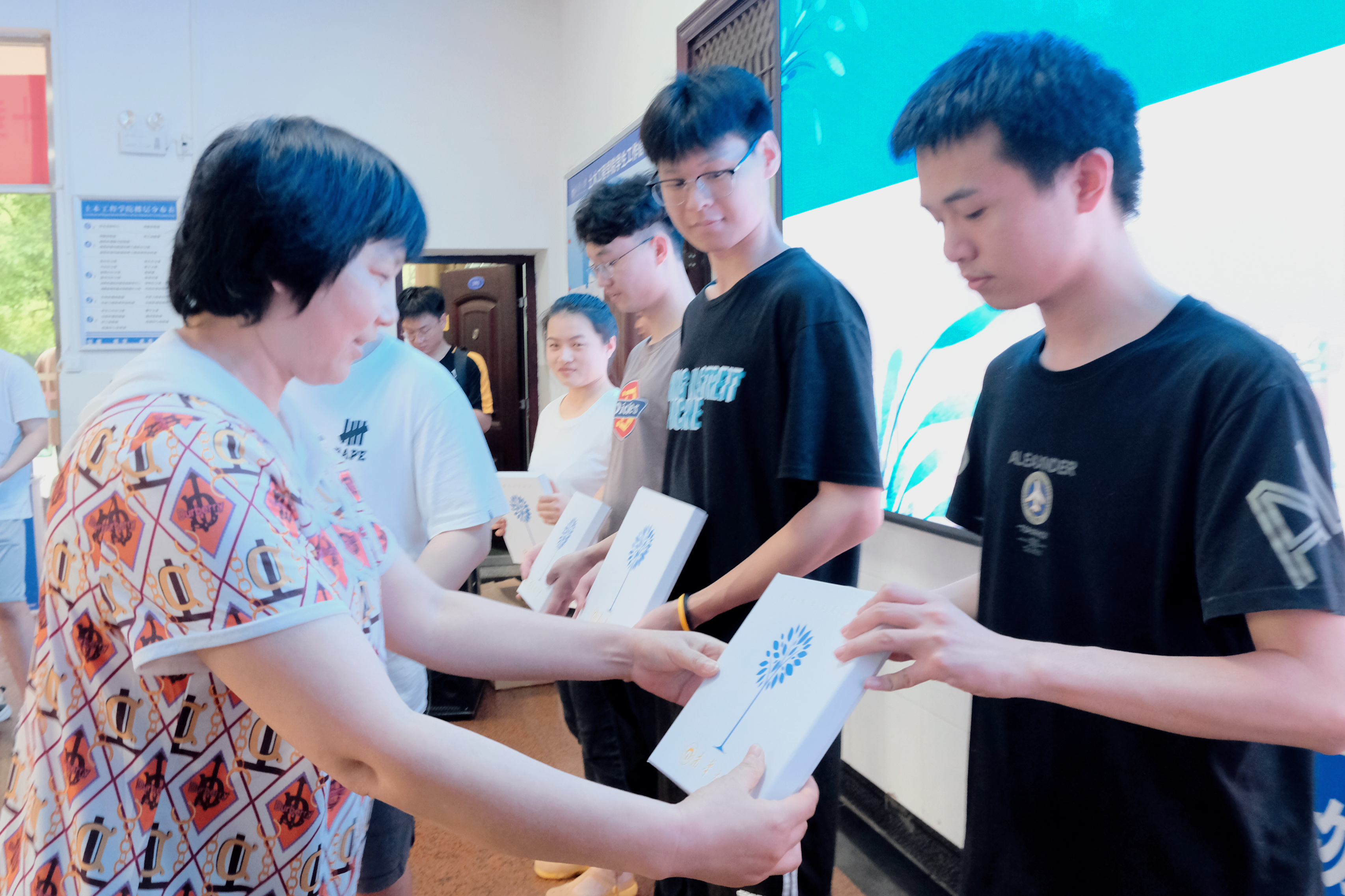 活动第二项为2022届毕业赠礼仪式,各班代表依次上前,由唐素芝老师、贺淑珍老师、刘华老师分别为各个班级代表进行赠礼,并合影留念。