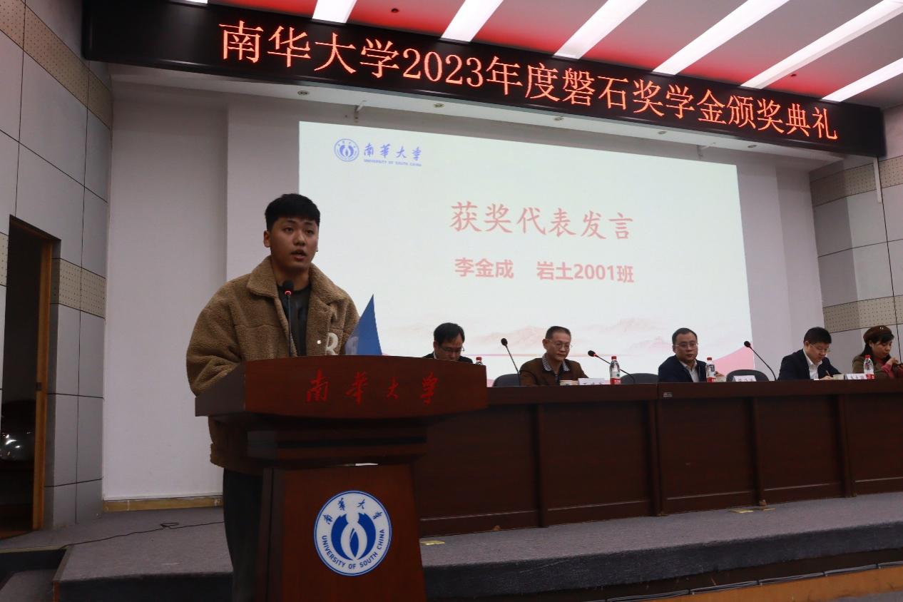 获奖学生代表李金成向各位校友、学院和老师表达了诚挚的敬意,并回顾大学一路走来的求学经历,表明自己将在日后敢于挑战、探索创新、不负期望。